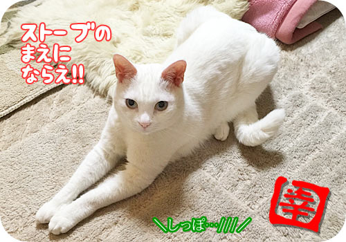 ストーブの前では、足を揃えるかクロスになってるかどちらかです。
